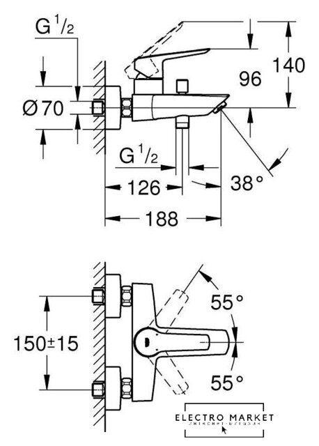 однорычажный смеситель для ванны и душа, монтаж на стену