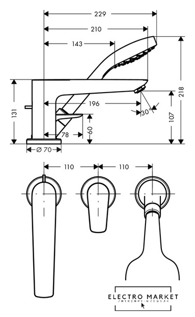 однорычажный смеситель для ванны и душа, монтаж на ванну или полку