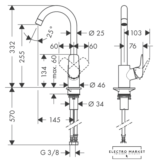 однорычажный смеситель для ванны и душа, монтаж на стену