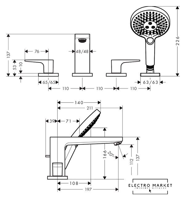 однорычажный смеситель для ванны и душа, монтаж на ванну или полку