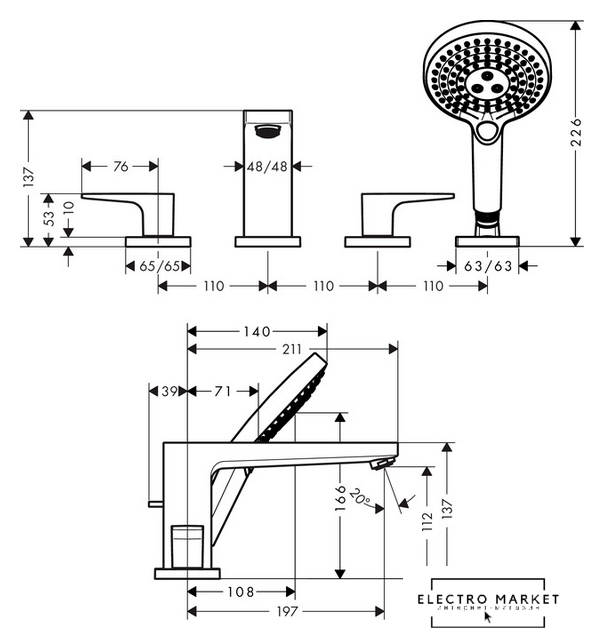 однорычажный смеситель для ванны и душа, монтаж на ванну или полку