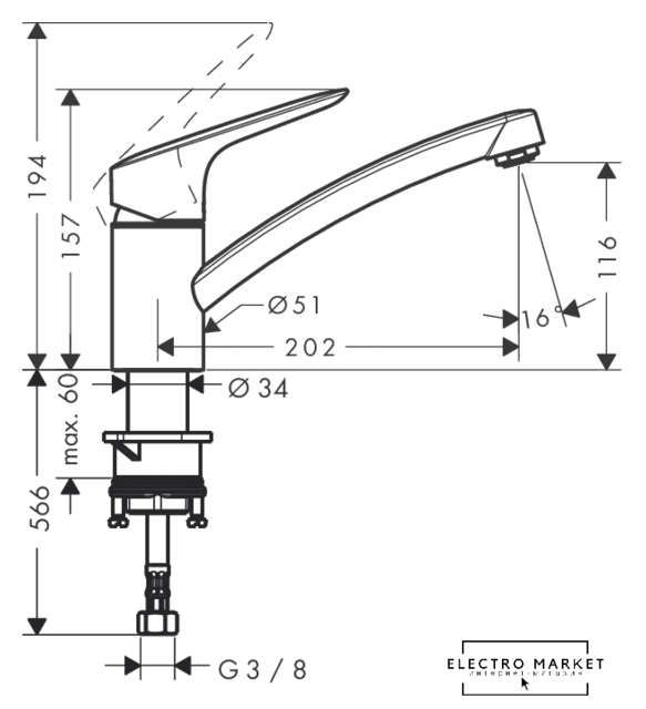 | Длина (вылет) излива | 202 мм |
