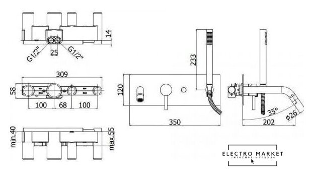 термостатический смеситель для ванны и душа, монтаж скрытый