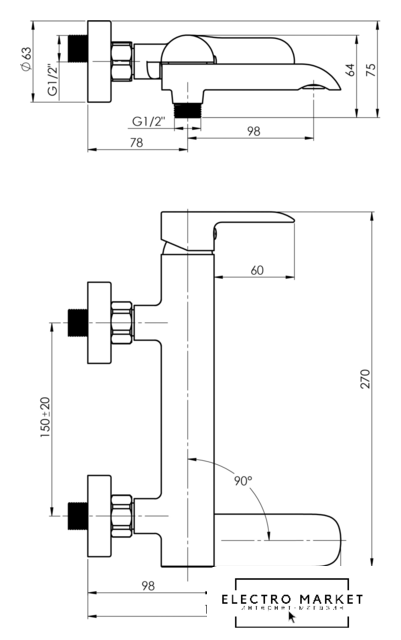 однорычажный смеситель для ванны и душа, монтаж на стену