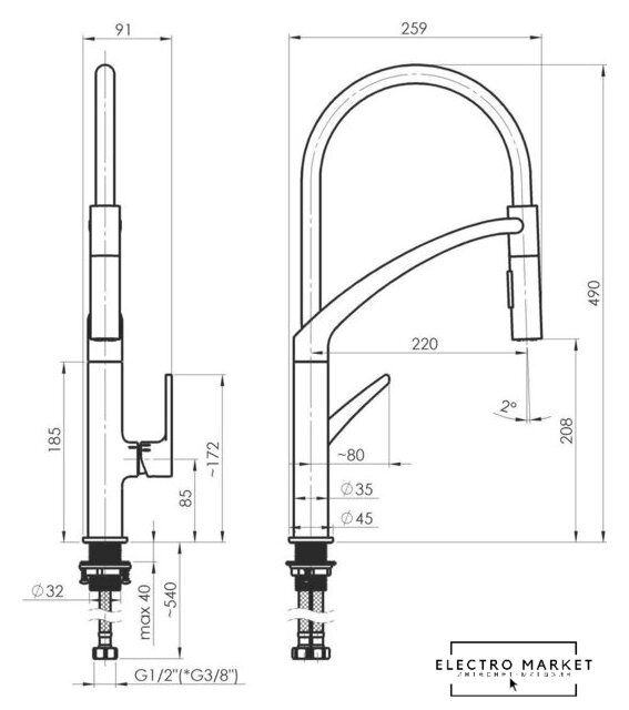 | Выдвижной/гибкий излив | с аэратором (гибкий шланг) |