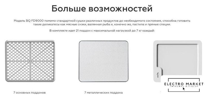 | Комплектация | 7 основных поддонов7 металлических поддонов7 поддонов для пастилы |