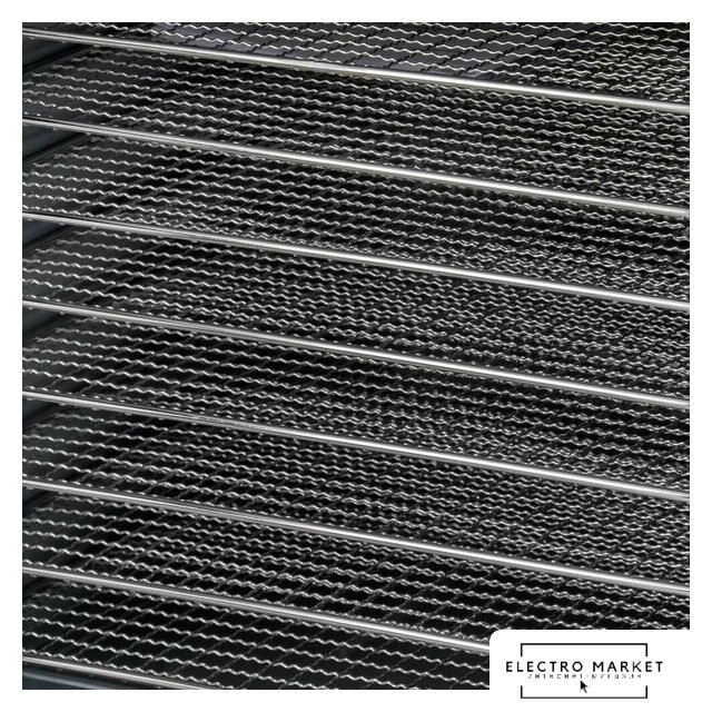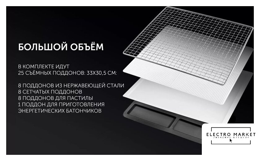 | Комплектация | 25 поддонов c размерами 33x30,5 см;- 8 поддонов из нержавеющей стали- 8 гибких сетчатых листов- 8 гибких поддонов для пастилы- 1 поддон для приготовления энергетических батончиков |