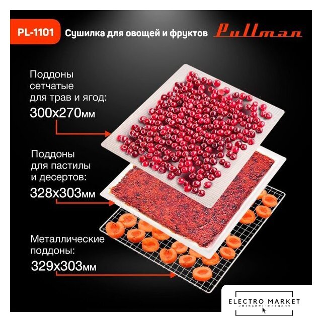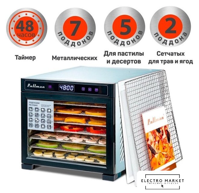 | Комплектация | 7 поддонов из нержавеющей стали. 5 поддонов для пастилы. 2 сетки для мелких продуктов.Книга рецептов в комплекте |