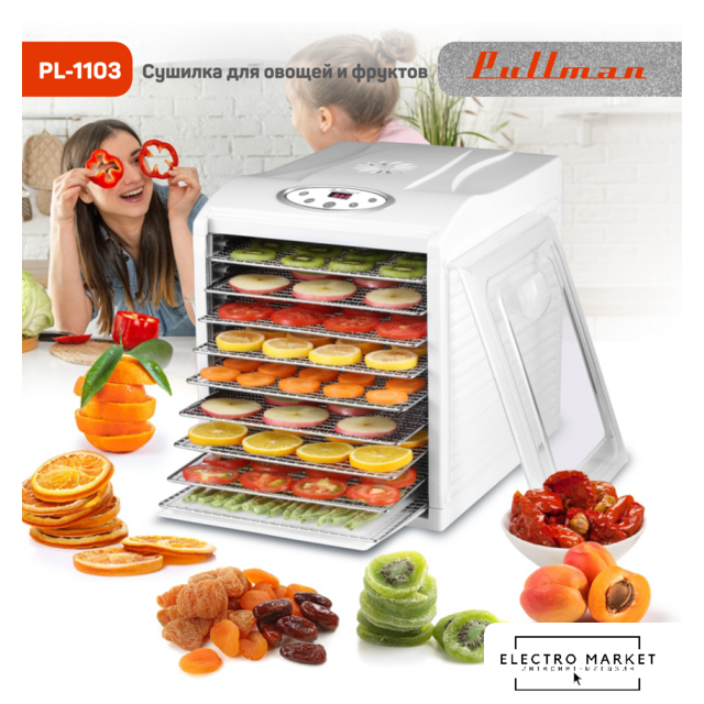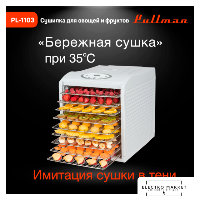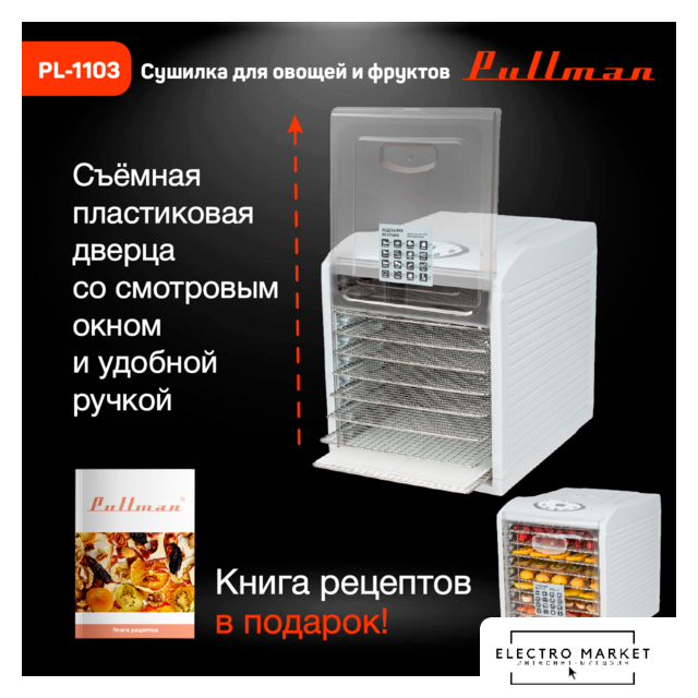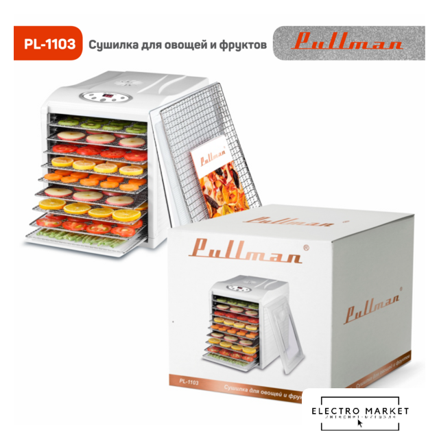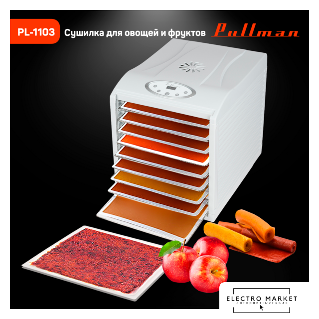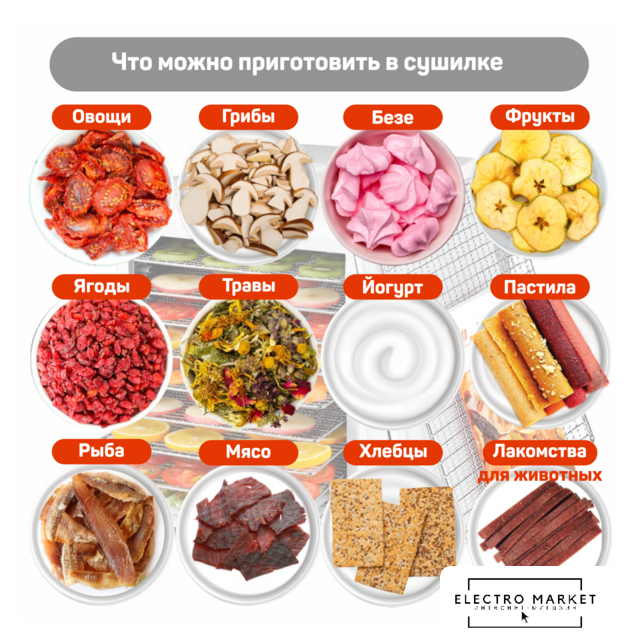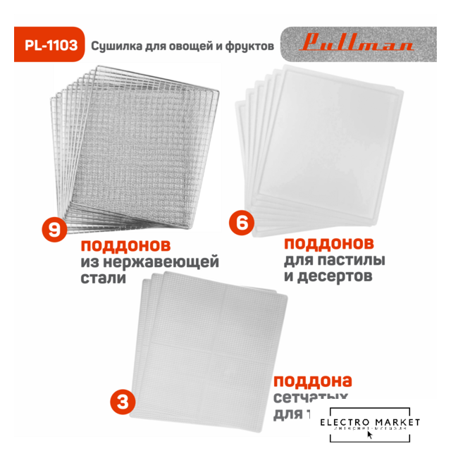 | Комплектация | 9 поддонов из нержавеющей стали6 поддонов для пастилы3 сетки для мелких продуктов |