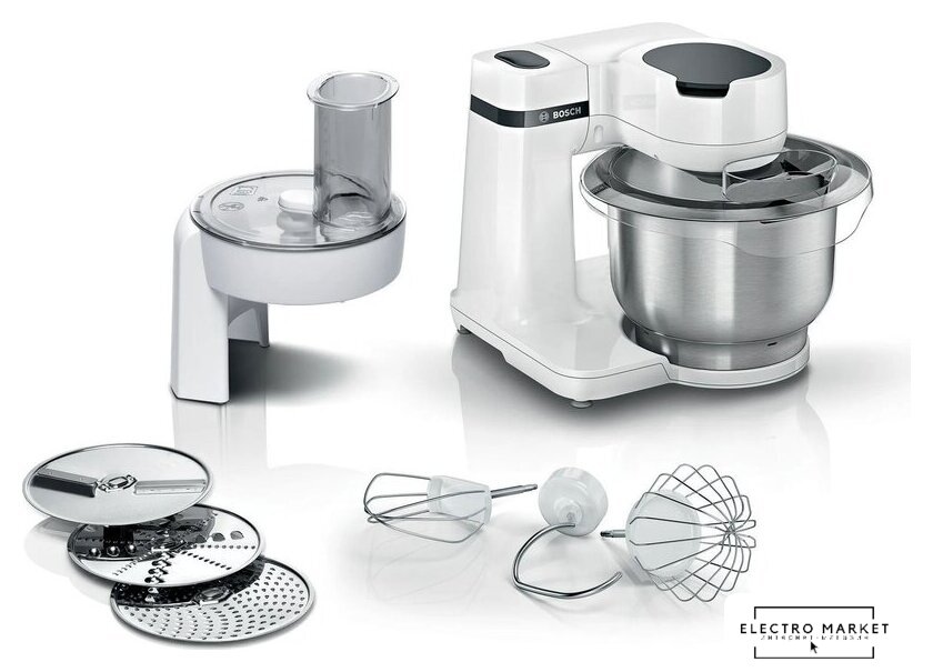 | Полная комплектация | Измельчитель овощей и фруктов с 3 сменными дисками из нержавеющей стали (5 функций): двусторонний диск для нарезки (крупная и мелкая), двусторонний диск для нарезки (крупная и мелкая) и диск для мелкой терки. 3 профессиональных миксера порадуют каждого любителя точной и быстрой работы: насадка для смешивания с силиконом, насадка для венчика и крюк для теста. |