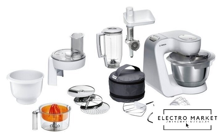 1000 Вт, планетарное смешивание, объем чаши: 3.9 л, терки, мясорубка, блендер
