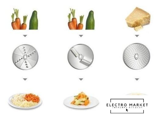 | Функции | мясорубка, блендер, цитрус-пресс, взбивание, смешивание, замешивание дрожжевого теста, терка, шинковка, ломтерезка |
