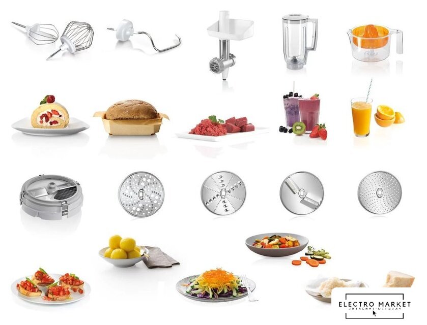 | Функции | мясорубка, блендер, взбивание, смешивание, замешивание дрожжевого теста, терка, шинковка, ломтерезка, нарезание кубиками, драники |