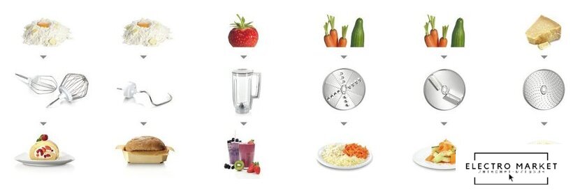 | Функции | блендер, взбивание, смешивание, замешивание дрожжевого теста, терка, шинковка, ломтерезка |