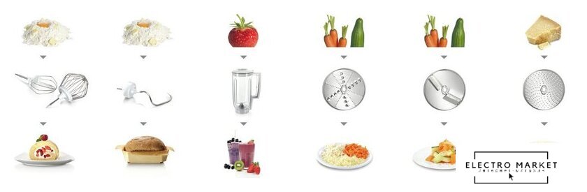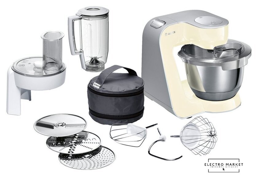 | Функции | блендер, взбивание, смешивание, замешивание дрожжевого теста, терка, шинковка, ломтерезка |