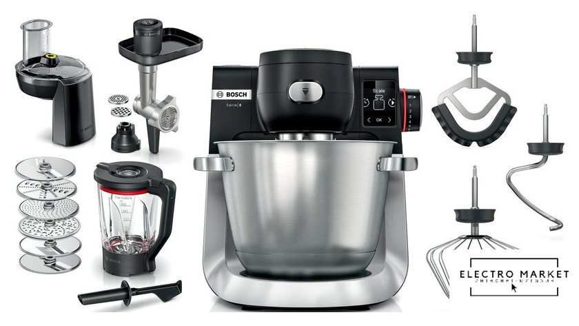 1600 Вт, планетарное смешивание, объем чаши: 5.5 л, терки, мясорубка, блендер