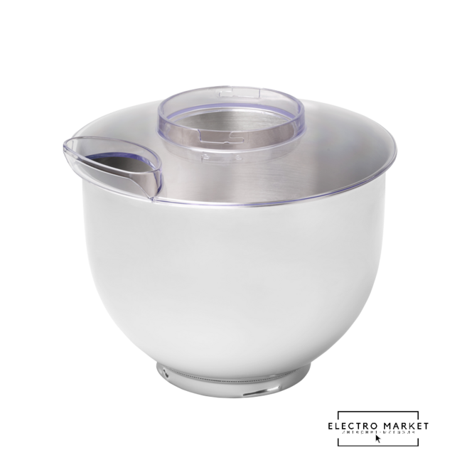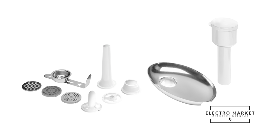 Полная комплектация | Емкость из нержавеющей стали 5 л + пластиковая крышкаНасадка для смешиванияКрюк для замешиванияВенчик1,5 л стеклянная чаша блендераМясорубка, 3 сменных диска, аксессуары для набивки сосисок и сарделекАксессуары для приготовления сладостейТерка с 5 сменными насадками |