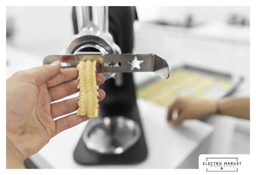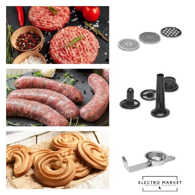 | Полная комплектация | Миска из нержавеющей стали 5 л с ручкой + крышкойВенчикГибкий наконечникМешалкаКрючок для замешиванияМясорубка (3 сменных диска с разной толщиной помола) + аксессуары для фарширования колбас + аксессуары для приготовления печеньяТерка с 5 сменными насадками. |