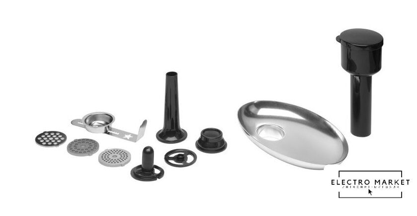Полная комплектация | Емкость из нержавеющей стали 5 л + пластиковая крышкаНасадка для смешиванияКрюк для замешиванияВенчик1,5 л стеклянная чаша блендераМясорубка, 3 сменных диска, аксессуары для набивки сосисок и сарделекАксессуары для приготовления сладостейТерка с 5 сменными насадками |