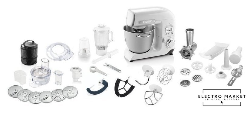 1500 Вт, планетарное смешивание, объем чаши: 5.5 л, терки, мясорубка, блендер