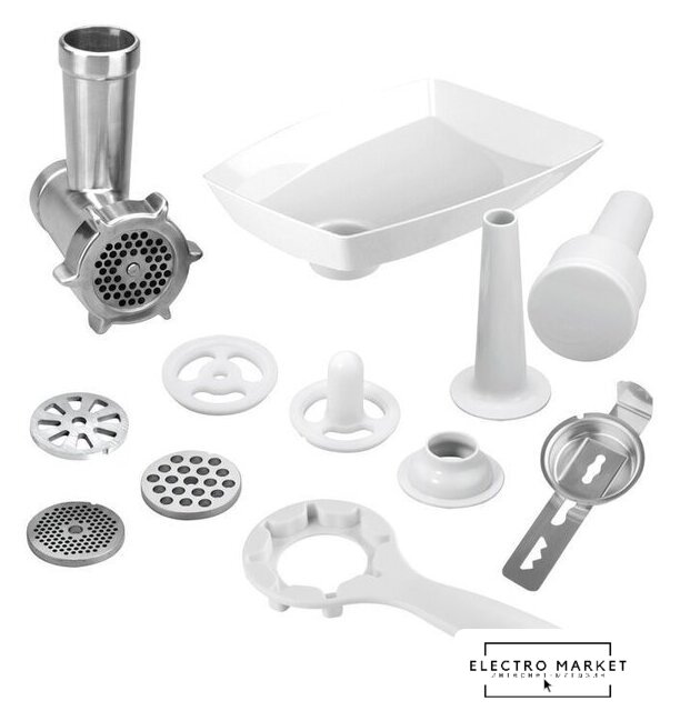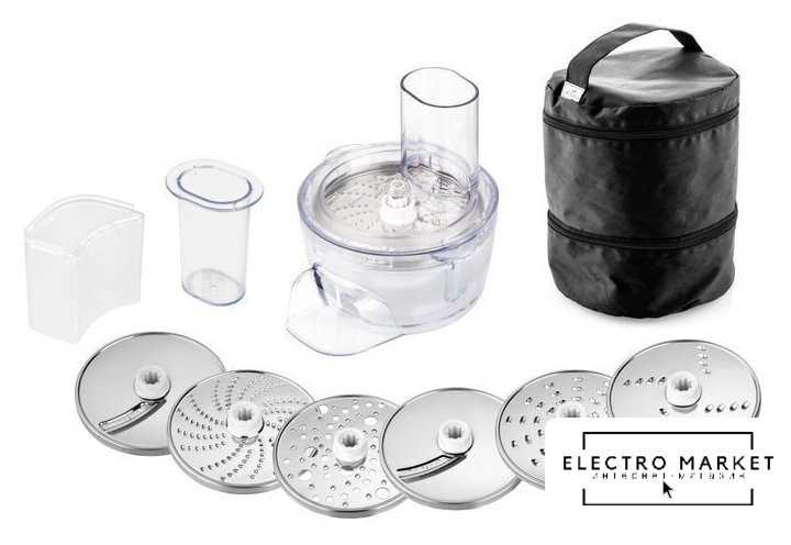 | Функции | мясорубка, блендер, цитрус-пресс, взбивание, смешивание, замешивание дрожжевого теста, измельчитель, рубка, терка, шинковка, ломтерезка, приготовление мороженого |
