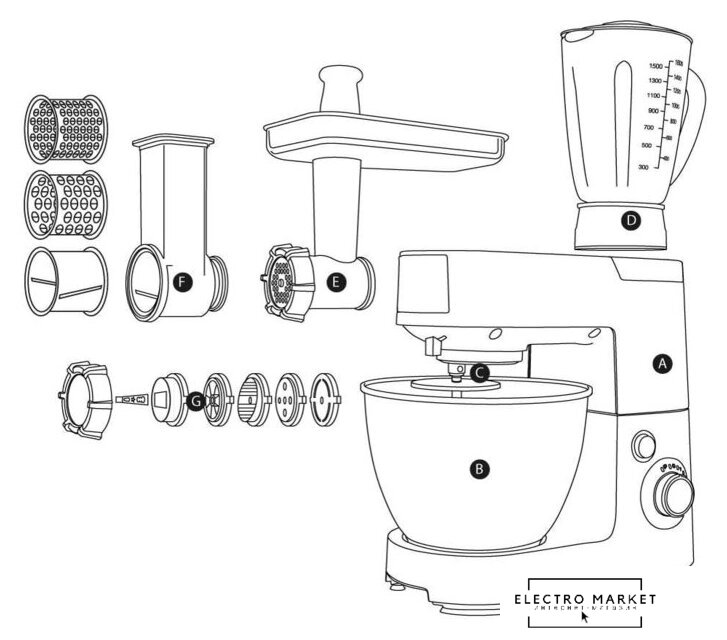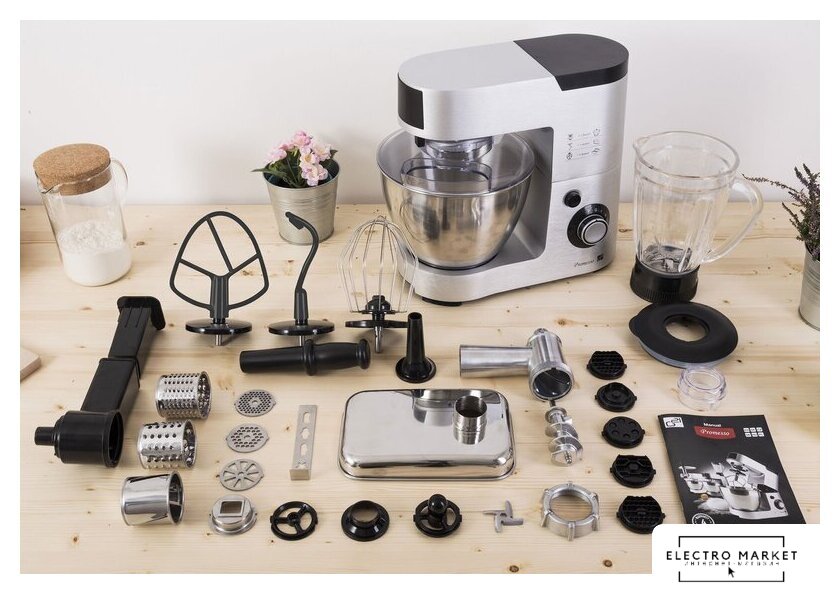 1500 Вт, планетарное смешивание, объем чаши: 6 л, терки, мясорубка, блендер