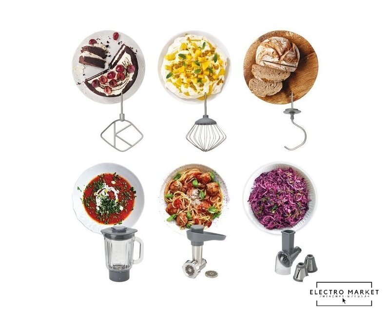 1000 Вт, планетарное смешивание, объем чаши: 4.3 л, терки, мясорубка, блендер