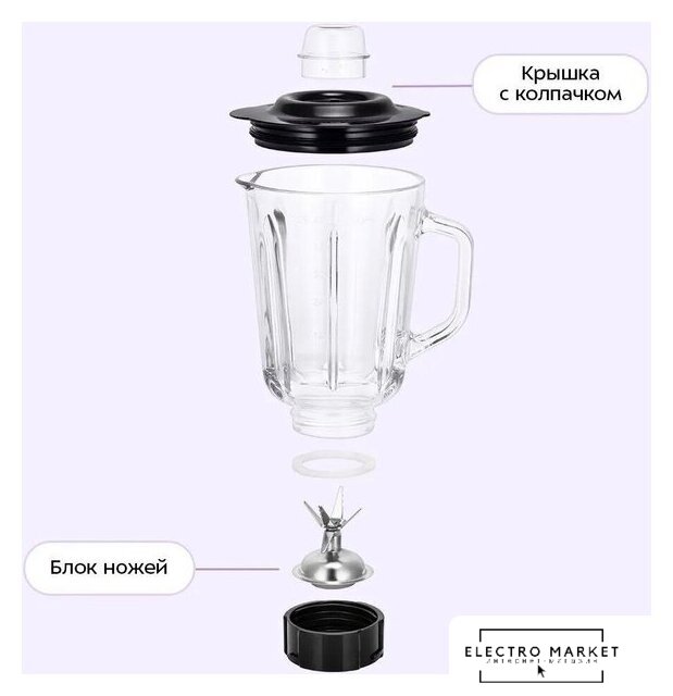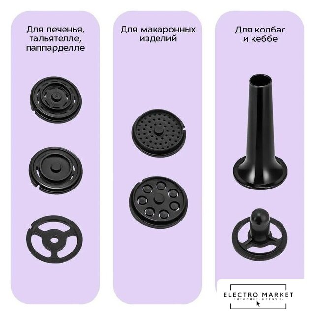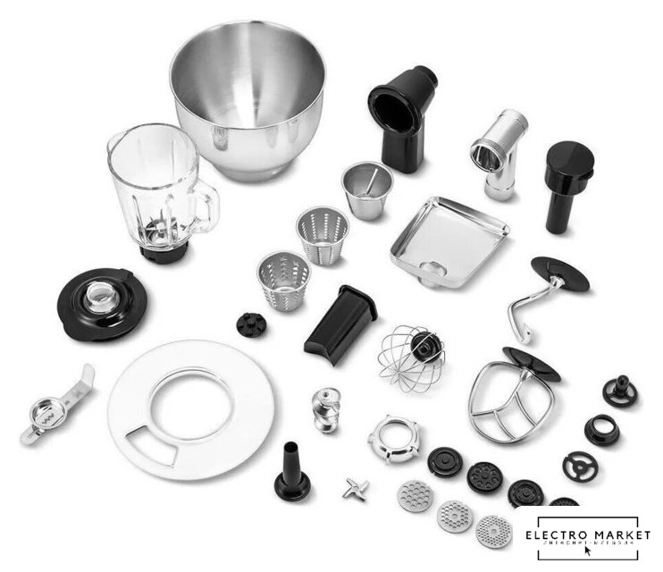 | Полная комплектация | основное устройство, чаша из нержавеющей стали 6.5 л, крышка на чашу, насадка-венчик, насадка для теста (крюк), насадка для смешивания, мясорубка с загрузочным лотком и толкателем, 3 решётки для мясорубки, 8 насадок для мясорубки (для печенья, пасты, кеббе, колбас), блендер с чашей 1.5 л из стекла, крышка для блендера, 3 тёрки/насадки для овощерезки, толкатель для тёрки, защитные крышки. |