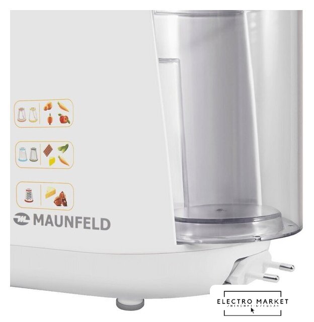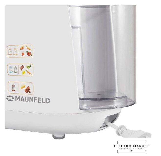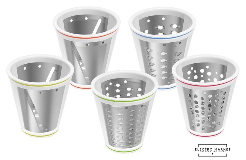 | Полная комплектация | три терки (мелкая, средняя, крупная), два шинковочных ножа, электрическая овощерезка, документация |