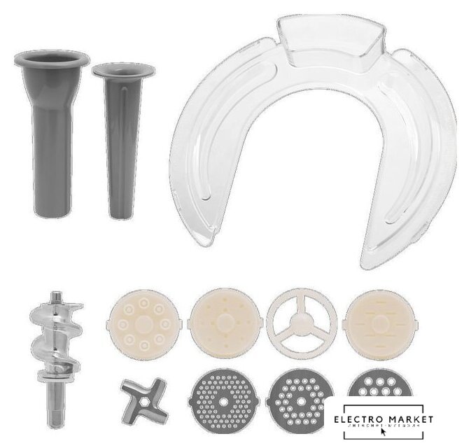 Полная комплектация | Нож двусторонний3 решетки с отверстиями3 решетки для лапшиПереходник для насадки для приготовления сосисок/колбасНасадка для сосисок/колбас |