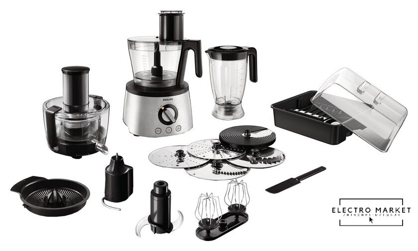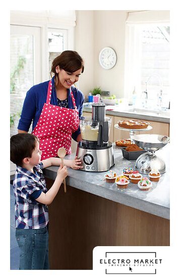 1000 Вт, планетарное смешивание, объем чаши: 4.3 л, терки, измельчитель, мясорубка, соковыжималка, блендер