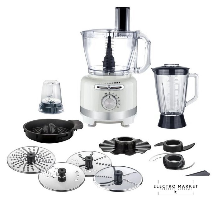| Полная комплектация | • Моторное основание;• Чаша измельчителя;• Толкатель;• Длинный вал;• Короткий вал;• Блендер с крышкой;• Диск эмульгатор;• Нож для измельчения;• Нож для теста;• Лопатка;• Диск – 4 шт (лезвие для нарезки картофеля фри; двухстороннее лезвие для крупной шинковки – диск-жюльен; двухстороннее лезвие для мелкой шинковки – диск-жюльен; терка для драников);• Соковыжималка;• Кофемолка;• Руководство пользователя |