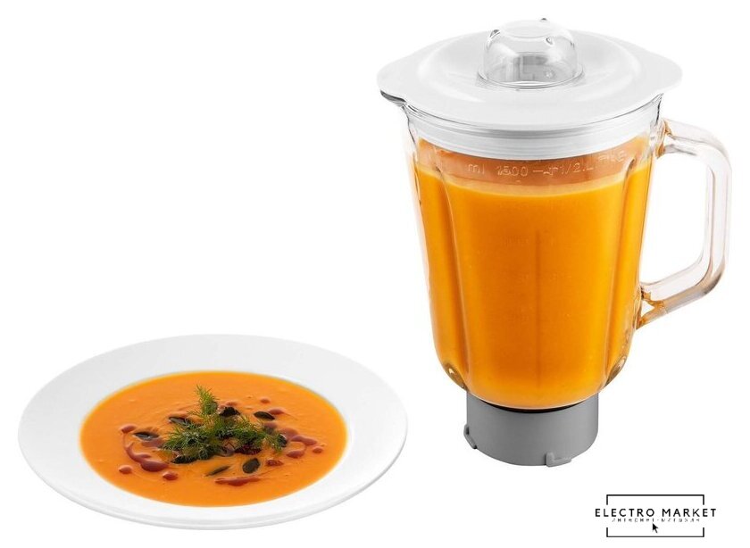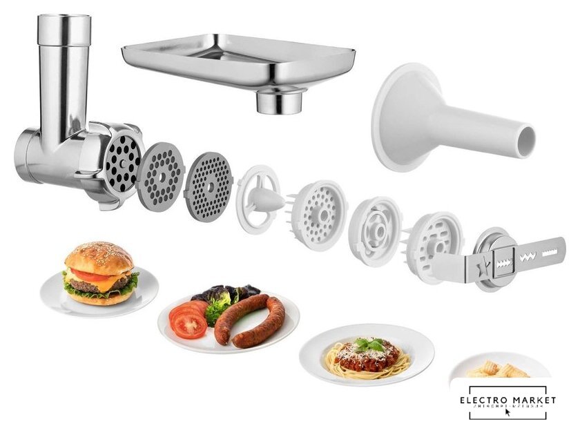 Полная комплектация | Стеклянная чаша блендера 1,5лЧаша миксера 5лДве насадки для смешиванияНасадка для тестаВенчикМясорубка с насадками для регулировки степени измельчения, набивки колбас, изготовления пасты и насадкой-шаблоном для формовки печеньяТолкательОвощерезка с 4 терками (мелкая терка, крупная терка, измельчение, нарезка ломтиками)Миксер для смузи 0,6л с крышкой для использования в качестве дорожной бутылки |