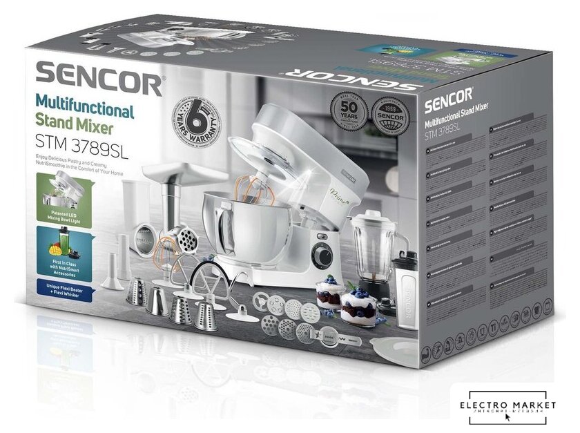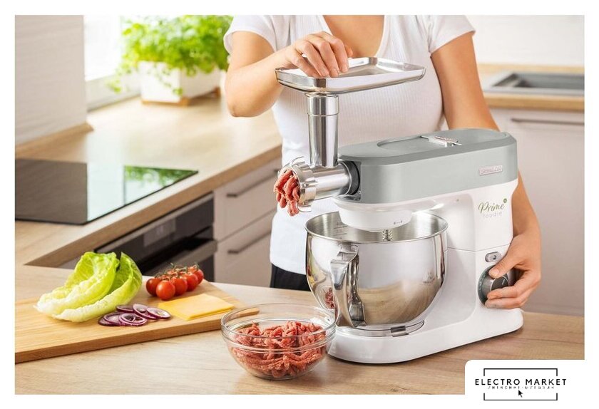 1200 Вт, планетарное смешивание, объем чаши: 6 л, мясорубка