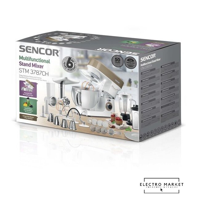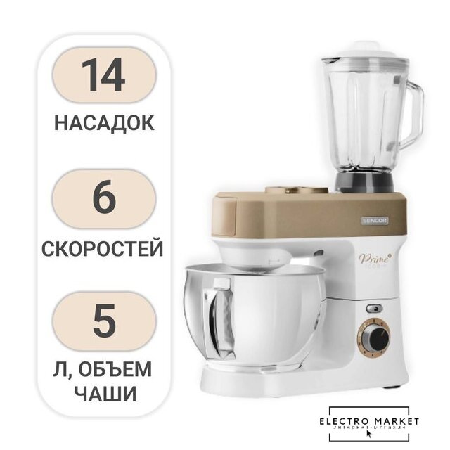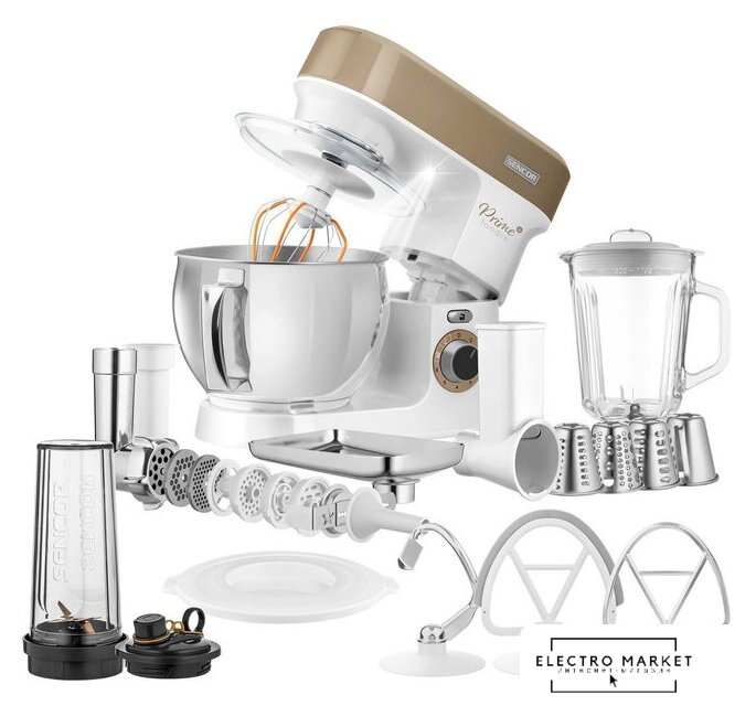 1200 Вт, планетарное смешивание, объем чаши: 6 л, мясорубка