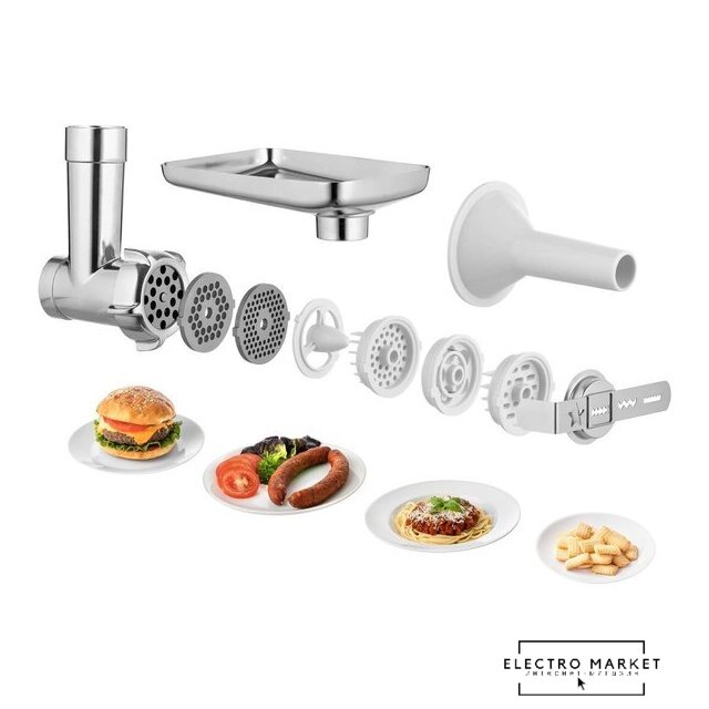 Полная комплектация | Стеклянная чаша блендера 1,5лЧаша миксера 5лДве насадки для смешиванияНасадка для тестаВенчикМясорубка с насадками для регулировки степени измельчения, набивки колбас, изготовления пасты и насадкой-шаблоном для формовки печеньяТолкательОвощерезка с 4 терками (мелкая терка, крупная терка, измельчение, нарезка ломтиками)Миксер для смузи 0,6л с крышкой для использования в качестве дорожной бутылки |