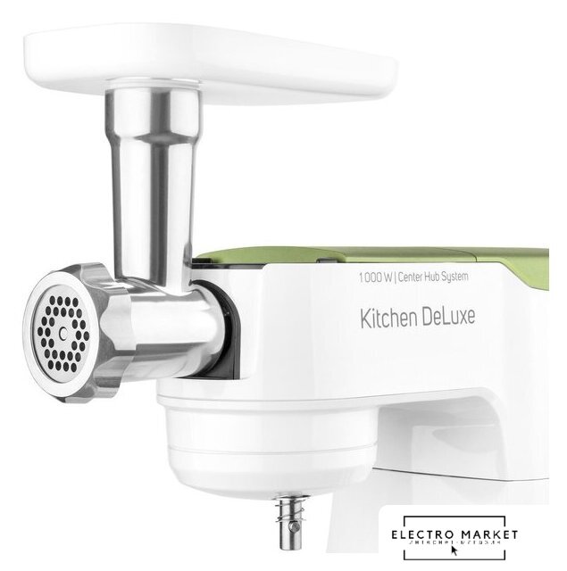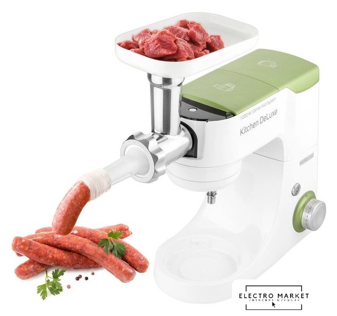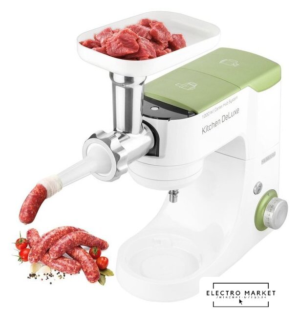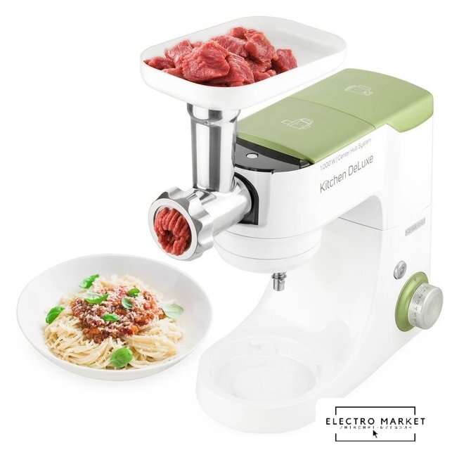 Полная комплектация | крюк для замеса, взбивающий венчик в форме буквы А, сферический венчик для взбивания. Насадка для заполнения копченостей с 2 диаметрами. 2 бутылки из материала Тритан с 2 охлаждающими элементами (ICE STICK). Настольный миксер с титановыми лезвиями объёмом 1,25 л. Многофункциональный кухонный комбайн объемом 1,25 л, с 4 насадками и измельчителем. Мясорубка для грубого и мелкого помола с насадкой для заполнения копченостей с 2 диаметрами. Чаша для замеса объёмом 4,5 литра из нержавеющей стали и измерительной шкалой |