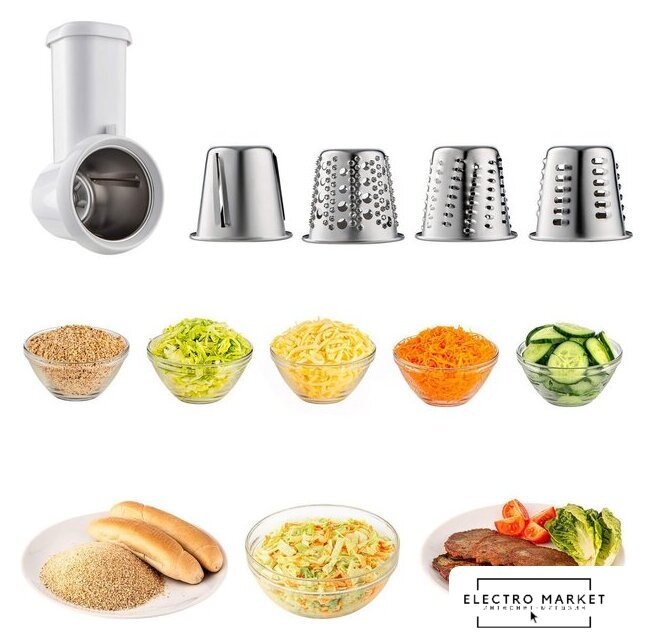 | Функции | мясорубка, блендер, взбивание, смешивание, замешивание дрожжевого теста, измельчитель, рубка, терка, шинковка, ломтерезка, помол круп, кофе |