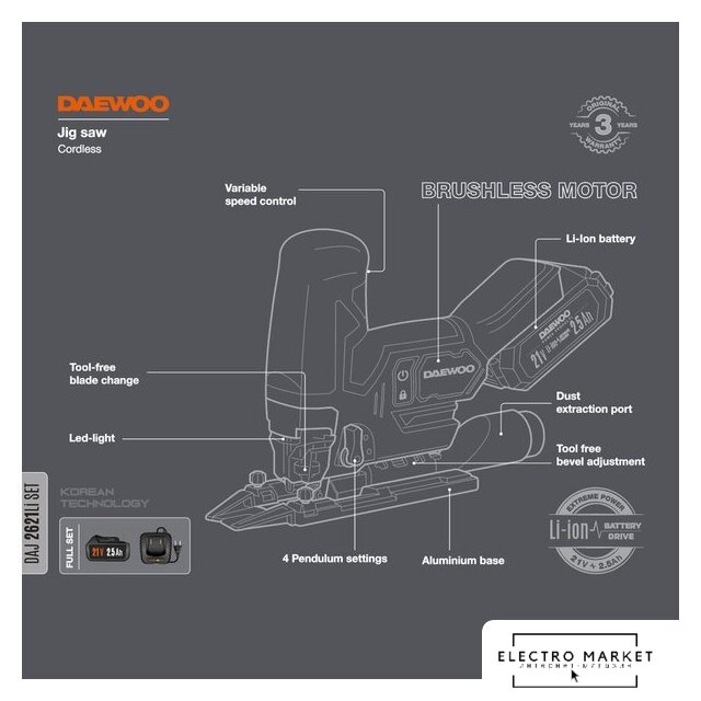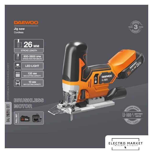 | Комплект поставки | - Лобзик - 1 шт.- Аккумулятор 2,0 Ач - 1 шт.- Зарядное устройство - 1 шт.- Пильное полотно -1 шт .- Адаптер для пылесоса 1 шт.- Параллельный упор - 1 шт.- Защитные крышки - направляющие - 1 компл.- Руководство по эксплуатации - 1 шт.- Коробка |