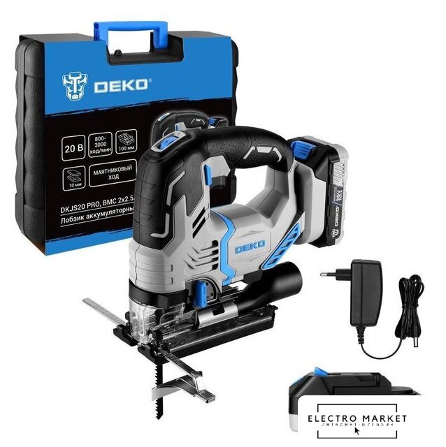 Комплект поставки | - Лобзик – 1 шт.- Аккумулятор 2,5 Ач – 2 шт.- Зарядное устройство – 1 шт.- Пильное полотно – 1 шт.- Параллельный упор – 1 шт.- Пылесборник - 1 шт.- Руководство по эксплуатации.- Кейс. |