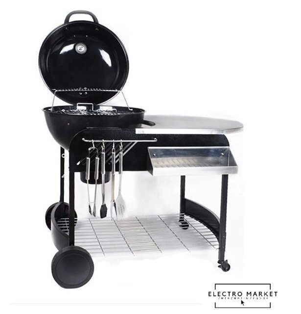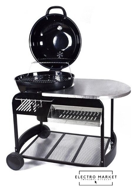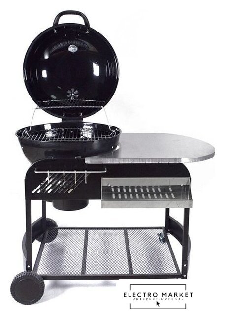 Комплект поставки | держатель шампуров (полка), дровница, золосборник, колеса (4 шт.), крючки для аксессуаров, решетка (1 шт. для барбекю, 1 шт. для угля), столешница (пристолье), встроенный термометр, крышка |