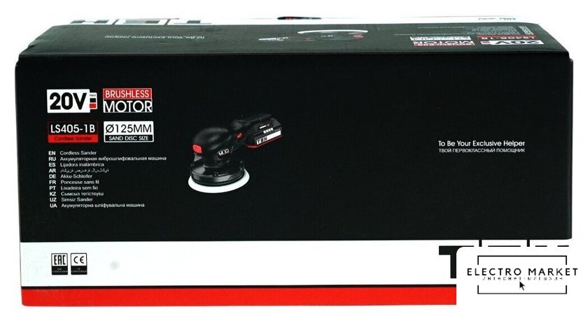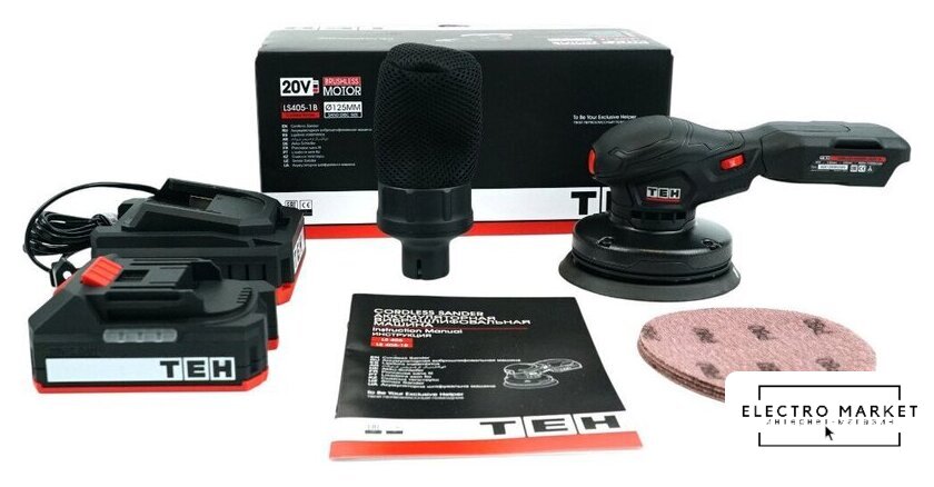 | Комплект поставки | - Эксцентриковая шлифмашина;, - Аккумуляторная батарея 2 Ач.;, - Зарядное устройство;, - Мешок для сбора пыли;, - Шлифовальные листы – 4 шт.;, - Руководство по эксплуатации;, - Упаковка (картонная коробка). |