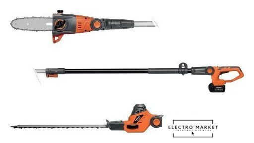 | Комплектация | - Кусторез - Защитный кожух ножей - Пила - Защитный кожух пилы - Телескопическая штанга - Наплечный ремень- Аккумулятор- Зарядное устройство- Руководство по эксплуатации |