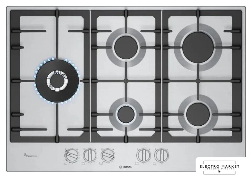 газовая на 5 конфорок, закаленное стекло, автоматический электроподжиг, газ-контроль, решетки: чугун, независимая установка, размеры (ШхГ): 90x51 см