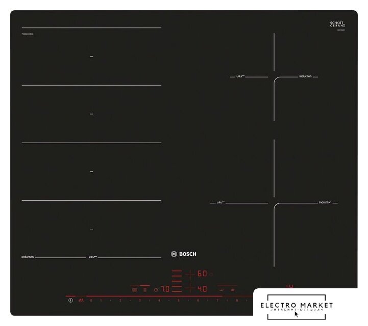 индукционная на 4 конфорки, cтеклокерамика, мощность: 8300 Вт, автоматика закипания, независимая установка, размеры (ШхГ): 78x52 см