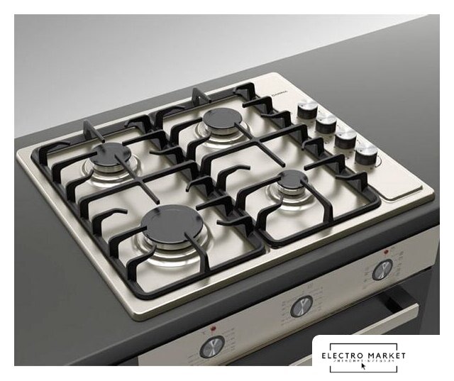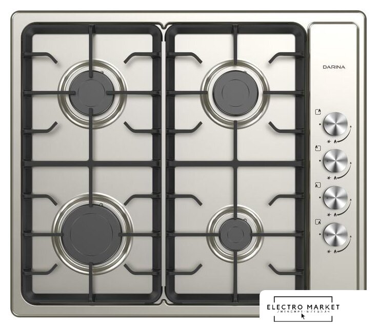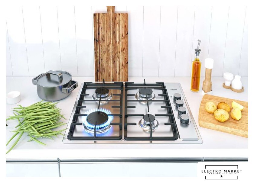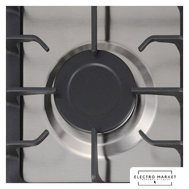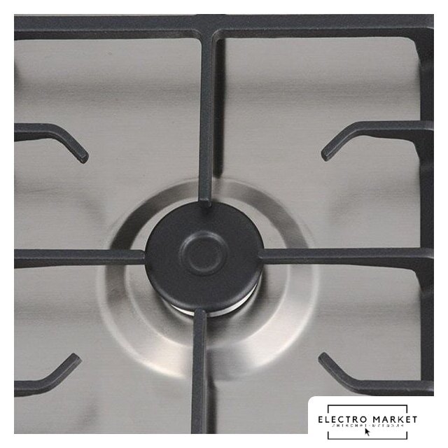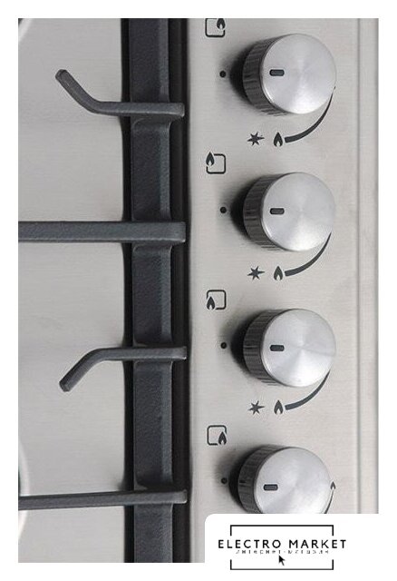 газовая на 4 конфорки, закаленное стекло, мощность: 7400 Вт, автоматический электроподжиг, газ-контроль, решетки: чугун