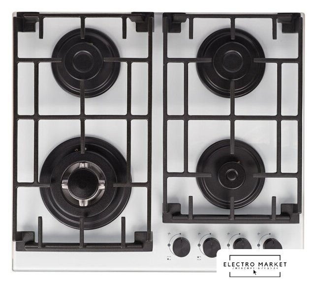 газовая на 4 конфорки, закаленное стекло, мощность: 8300 Вт, автоматический электроподжиг, газ-контроль, решетки: чугун, независимая установка