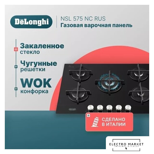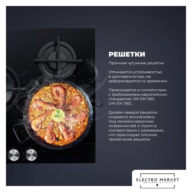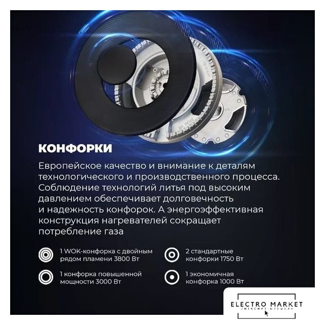 | Подробная информация о конфорках | 1 х WOK-конфорка с двойным рядом пламени 3800 Вт, 1 х конфорка повышенной мощности 3000 Вт, 2 х стандартная конфорка 1750 Вт, 1 x экономичная конфорка 1000 Вт |