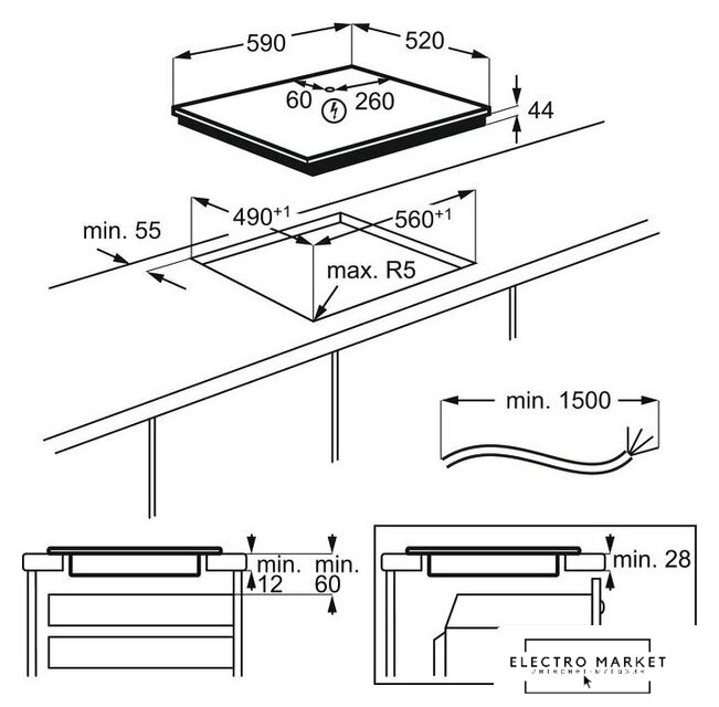индукционная на 4 конфорки, cтеклокерамика, мощность: 7400 Вт, автоматика закипания, независимая установка, размеры (ШхГ): 59.5x52 см