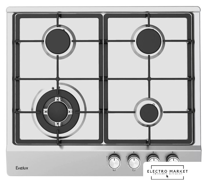 газовая на 4 конфорки, нержавеющая сталь, газ-контроль, решетки: чугун, размеры (ШхГ): 58.5x50 см